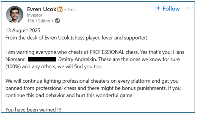 PROFESYONEL satrançta hile yapan herkesi uyarıyorum. Evet, sizler: Hans Niemann, A…, Dmitry Andreikin. Bunlar kesin bildiğimiz kişiler (%100) ve diğerleri, sizi de bulacağız. Her platformda profesyonel hile yapanlarla mücadeleye devam edeceğiz ve sizi profesyonel satrançtan men edeceğiz. Bu kötü davranışınıza devam ederseniz ve bu harika oyunu zedelerseniz, ek cezalar da alabilirsiniz.