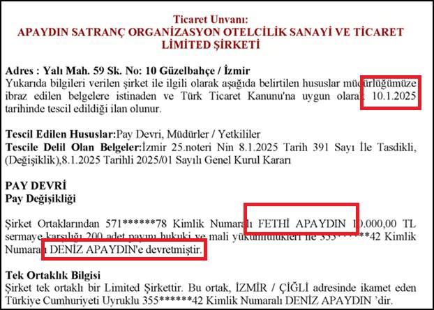 Bu işletmenin Fethi Apaydın başkan olduktan sonra 10 Ocak 2025 tarihinde Fethi beyin eşine devredilmesi, Türkçesi ile hileli işlemin daniskasıdır. Ya şirketin veya TSF’nin feshini gerektirir.