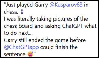 “Az önce Garry @Kasparov63 ile satranç oynadım. Satranç tahtasının fotoğraflarını çekip ChatGPT’ye bir sonraki hamlemi soruyordum. Garry, @ChatGPTapp cümlesini bitirmeden oyunu bitirdi”.