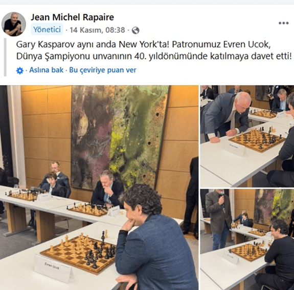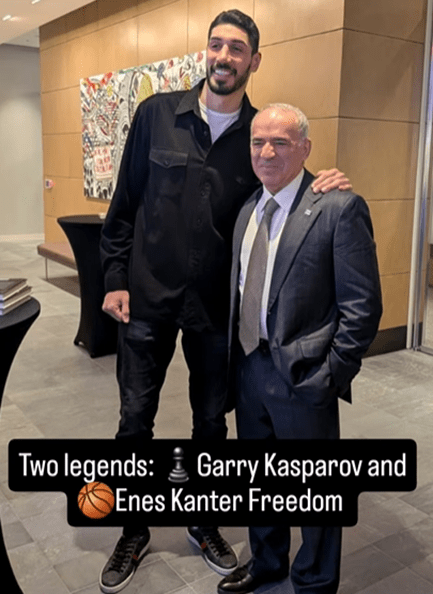 “İki Efsane. New York’ta Kasparov Satranç Vakfı tarafından düzenlenen ve ev sahipliği yapılan Garry Kasparov Dünya Şampiyonluğu 40. Yıl Dönümü etkinliğinde, 13. Dünya Satranç Şampiyonu Garry Kasparov, Türk-Amerikalı eski NBA oyuncusu ve insan hakları aktivisti Enes Kanter Freedom ile unutulmaz bir maç yaptı.”