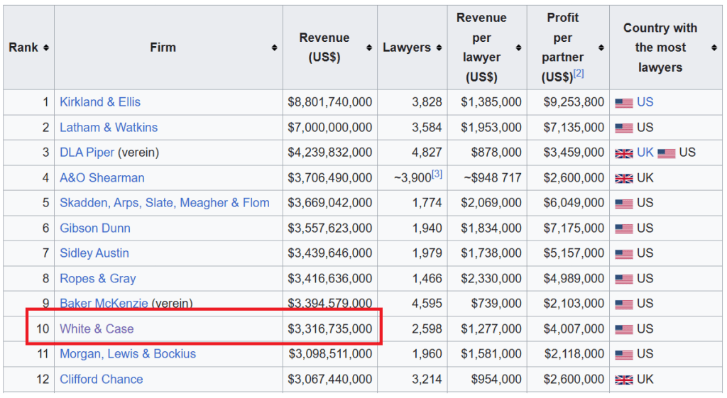 Arka planda White & Case Hukuk Bürosu. White & Case, dünya ölçeğinde 10.sırada. Yıllık geliri 3,3 milyar dolar. Büyüklüğü değil dikkat. 1 yıllık olağan geliri. 2,600 avukat istihdam ediyor. Küresel ölçekte 31 ülkede 46 ofisi var.