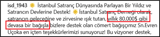 Bir başka deyişle İstanbul Satranç Derneği, Enes Kanter’le aynı etkinlikte yer alan Evren Üçok’u övgülere boğarken, Üçok’un derneğe 80 bin Dolar bağış yaptığını da aynı övgü yağmuru altında anlatıyor: